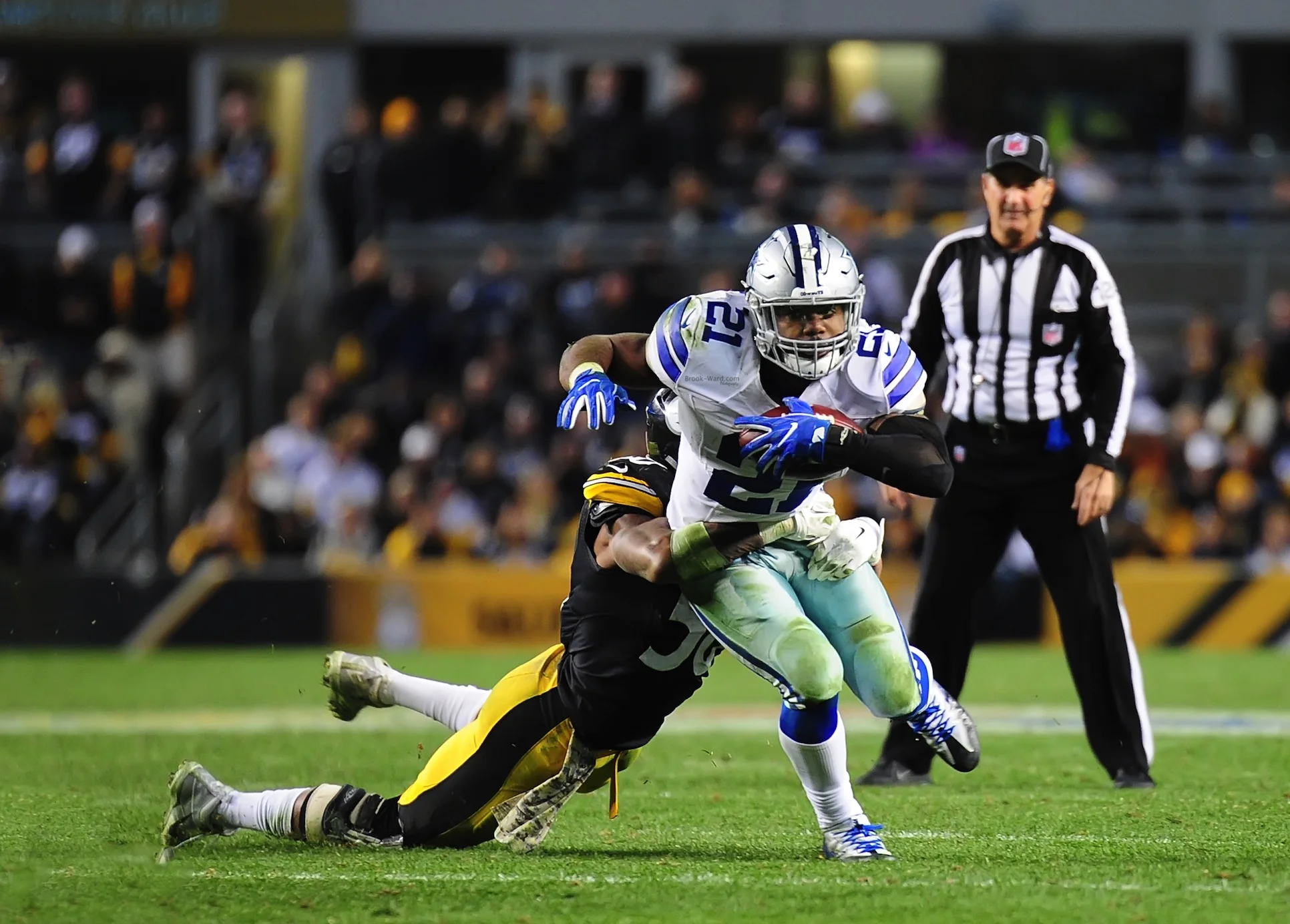 Ezekiel Elliott finishing a strong run against the Steelers defense.
