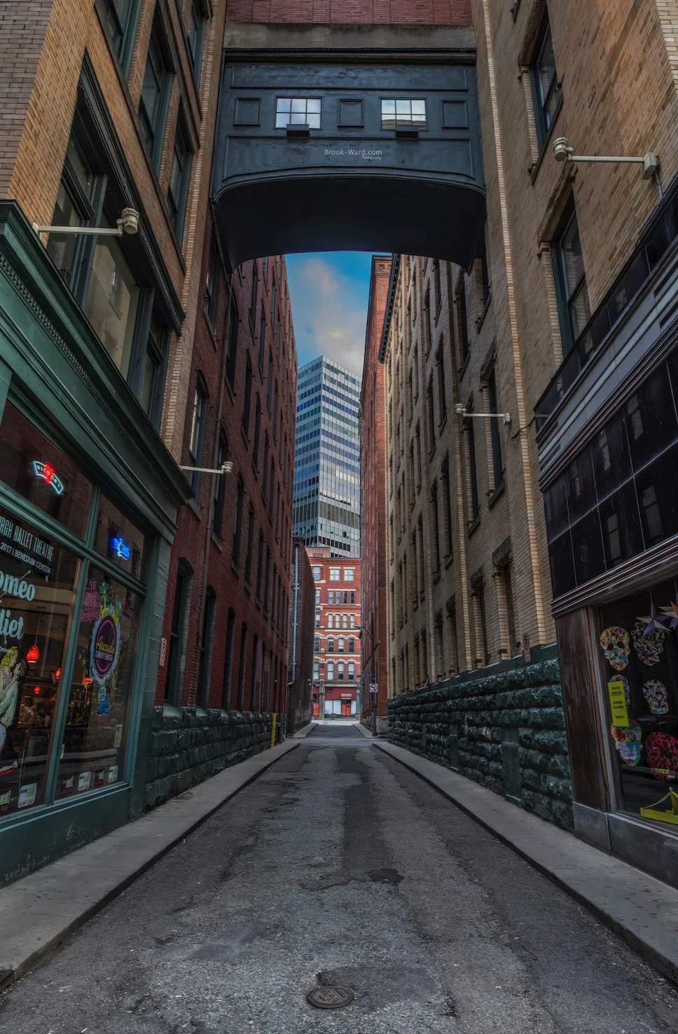 Blair and I were walking in the downtown Pittsburgh area after having dinner and we came upon this alley. I loved it immediately and setup my tripod for this perspective. I like the detail of the buildings in the foreground along with the office building at the end of the alley.