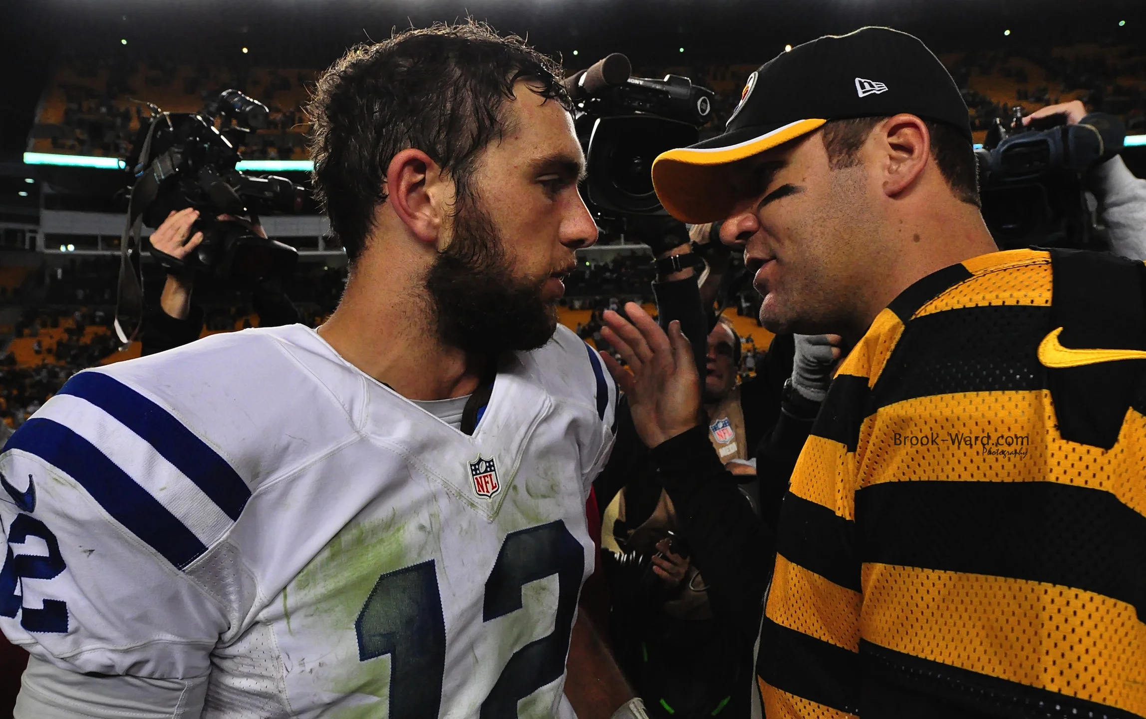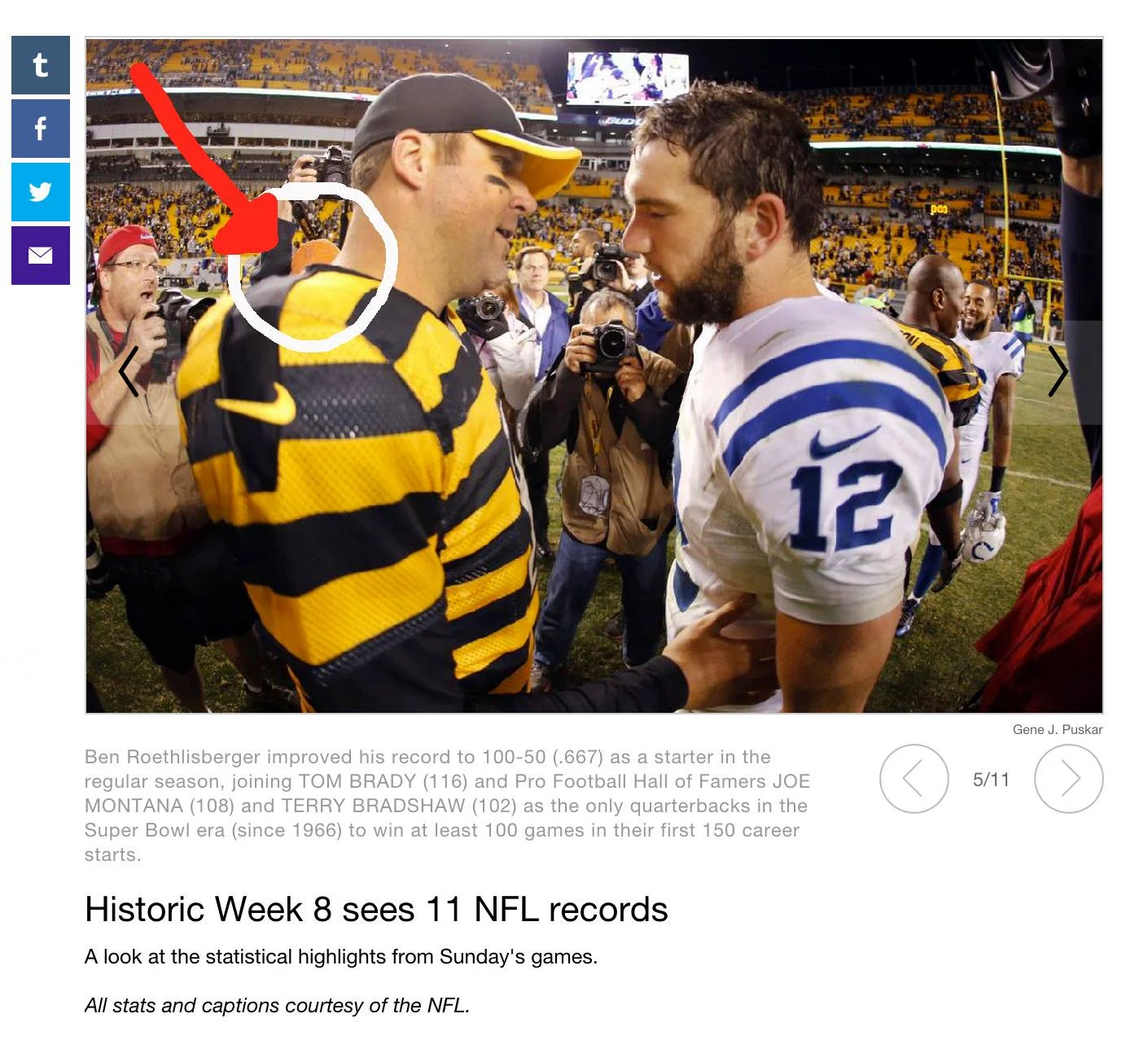 At the request of a few friends, I wore an orange hat at the Steelers vs. Colts game so they could try to find me on TV. As you've probably guessed, that is nearly impossible since close to 100 other photographers are forced to wear the same tan NFL vest. I've seen myself on TV watching a recorded game, but that's because I know where I was standing during specific times and plays. Well last night I found a photo on line of Big Ben and Andrew Luck talking after the game and I am in the photo. You'll have to look close and I've added some aids to point you in the right spot (remember the orange hat). Plus I'll post my picture of this same moment.