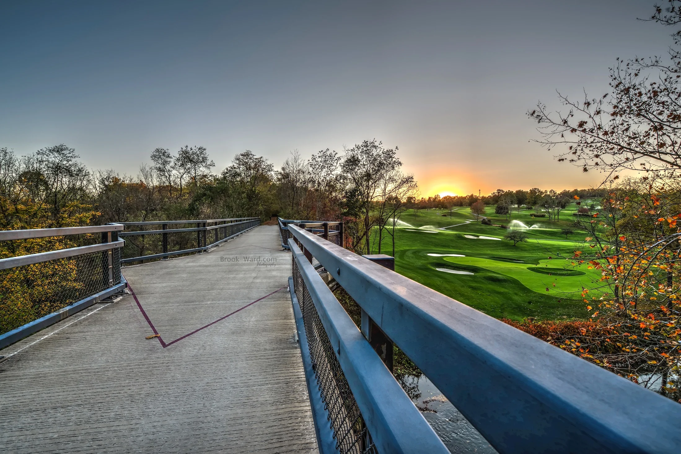 This photo was taken from a large bridge that crosses Chartiers Creek and runs past Valleybrook Golf Course in Washington County PA. I liked the combination of the trail (leading lines), the golf course and the sunset. What do you think?
