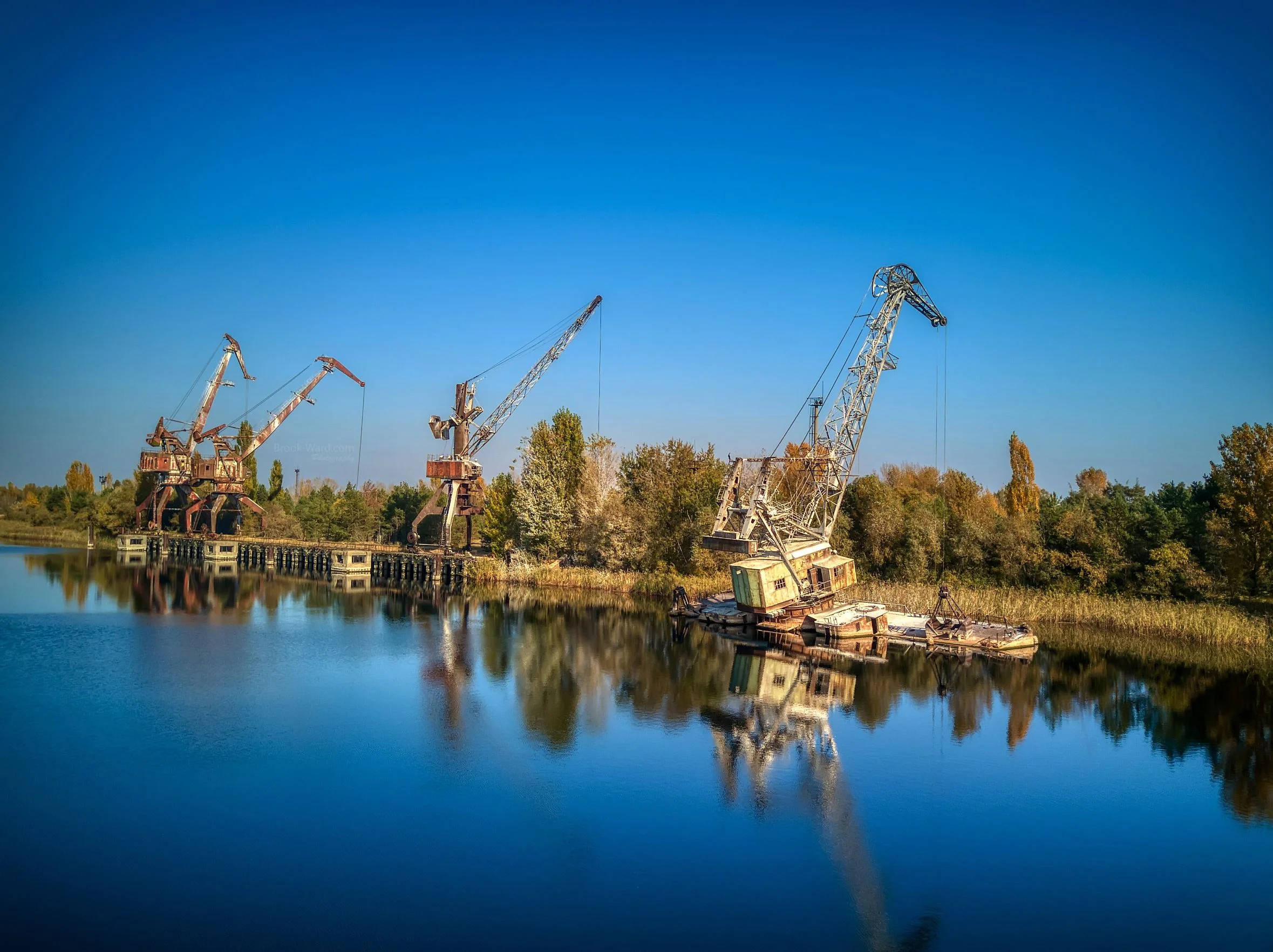 These cranes are abandoned on the river a short distance from the Chernobyl Nuclear Power Plant in Ukraine.