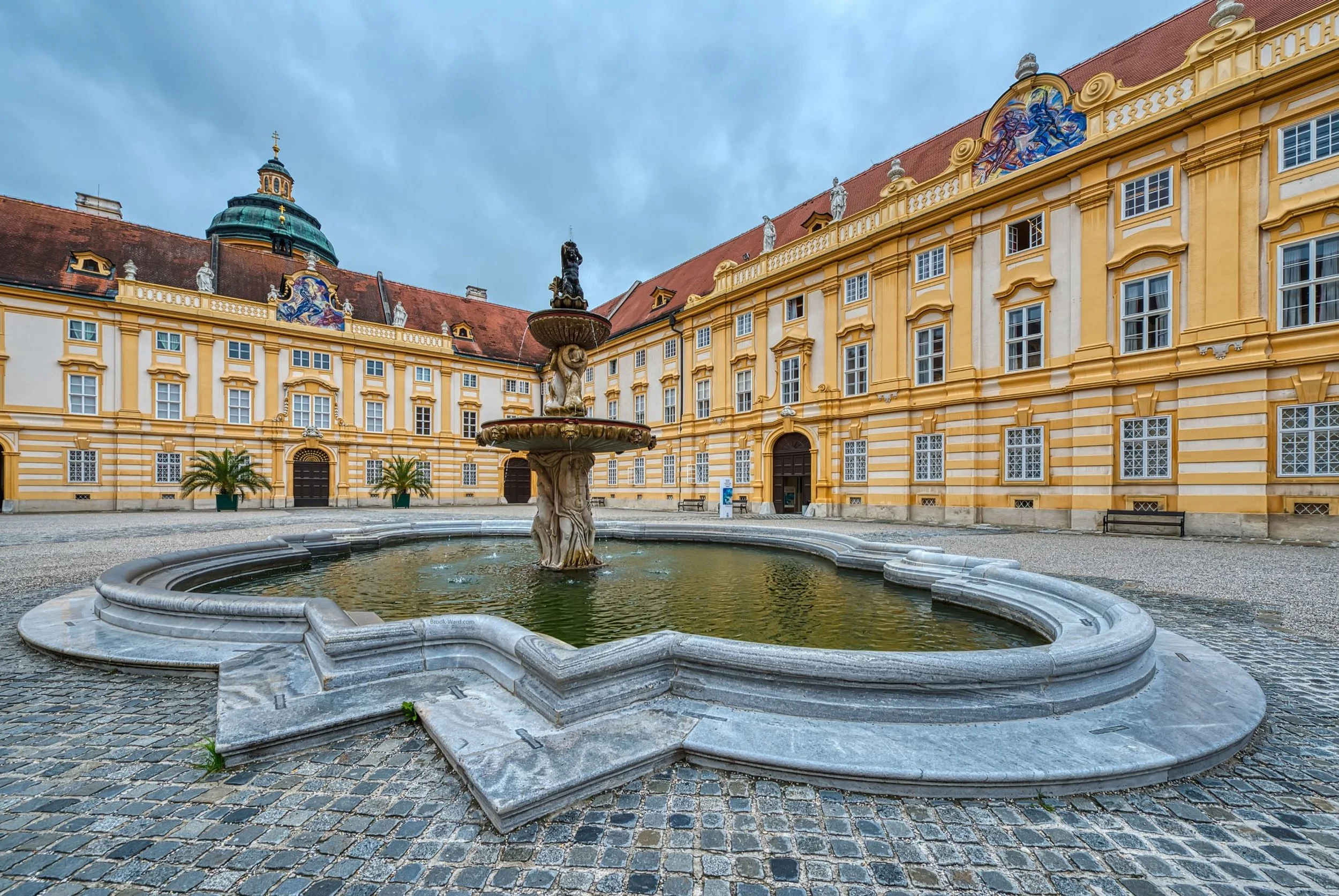 This Benedictine abbey in the town of Melk Austria sits upon a hill top overlooking the Melk village and the Danube river in the Wachau valley. The abbey was started in 1089. The abbey started the monastic school in the 12th century and today has over 900 students. This building was built starting in 1702 and finished in 1736. I took this photo inside an internal courtyard.