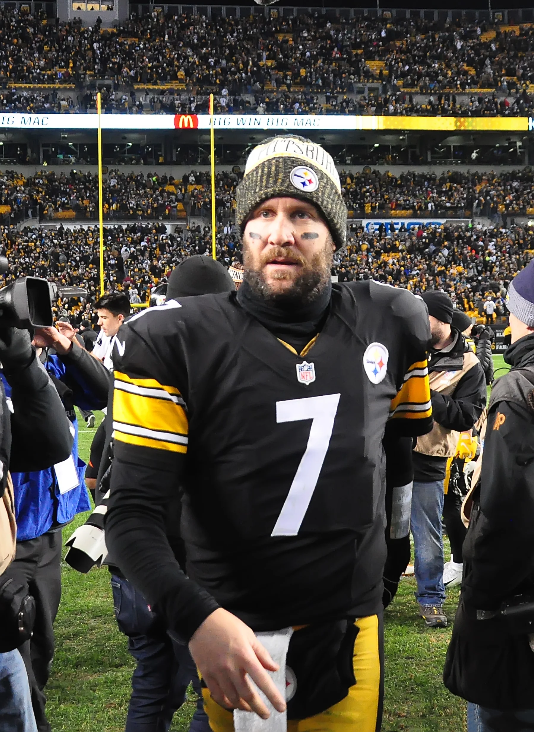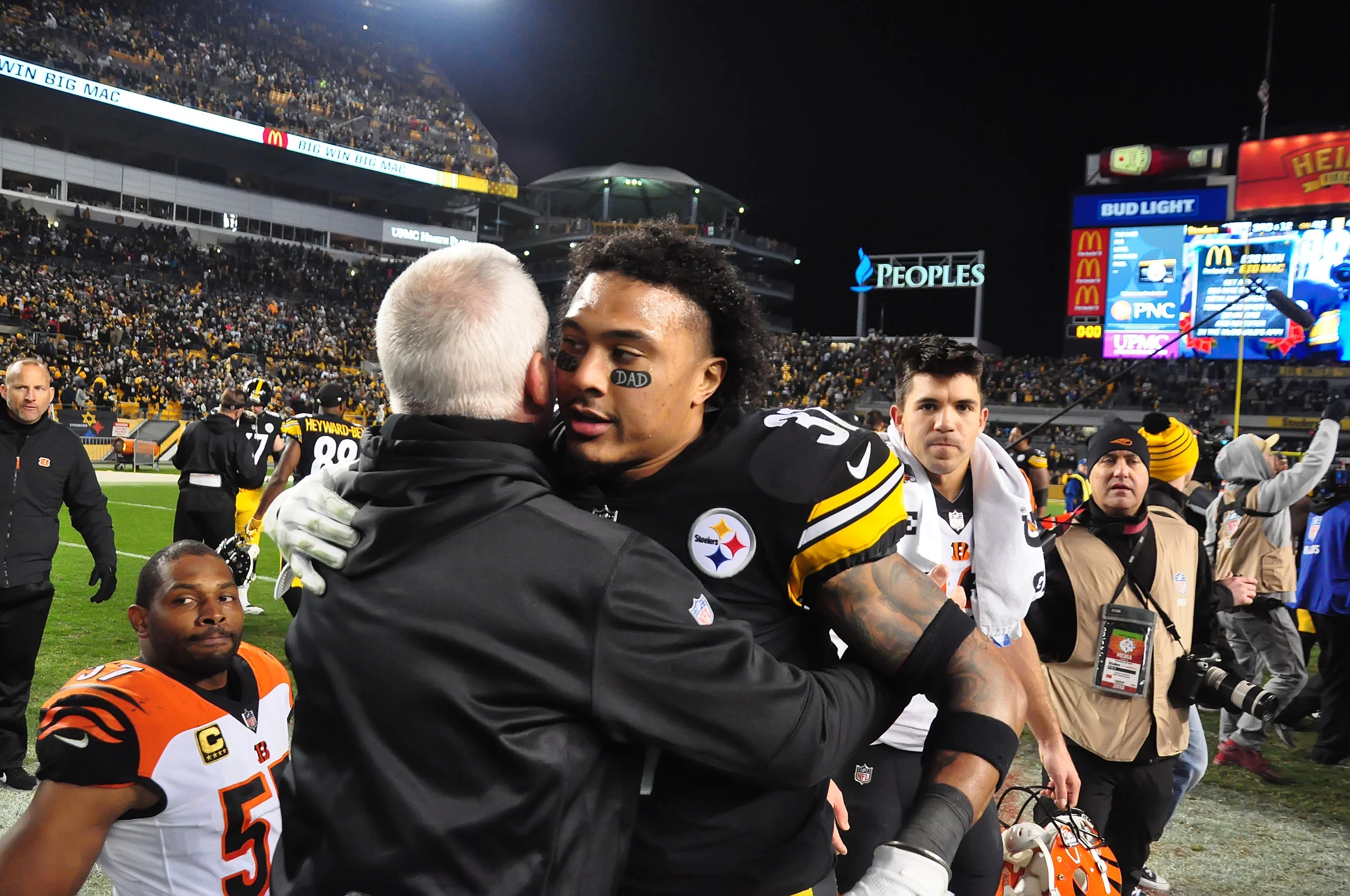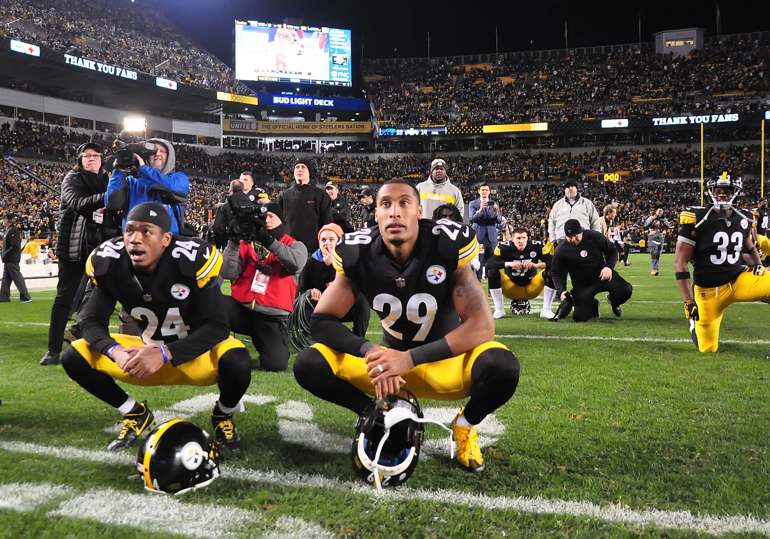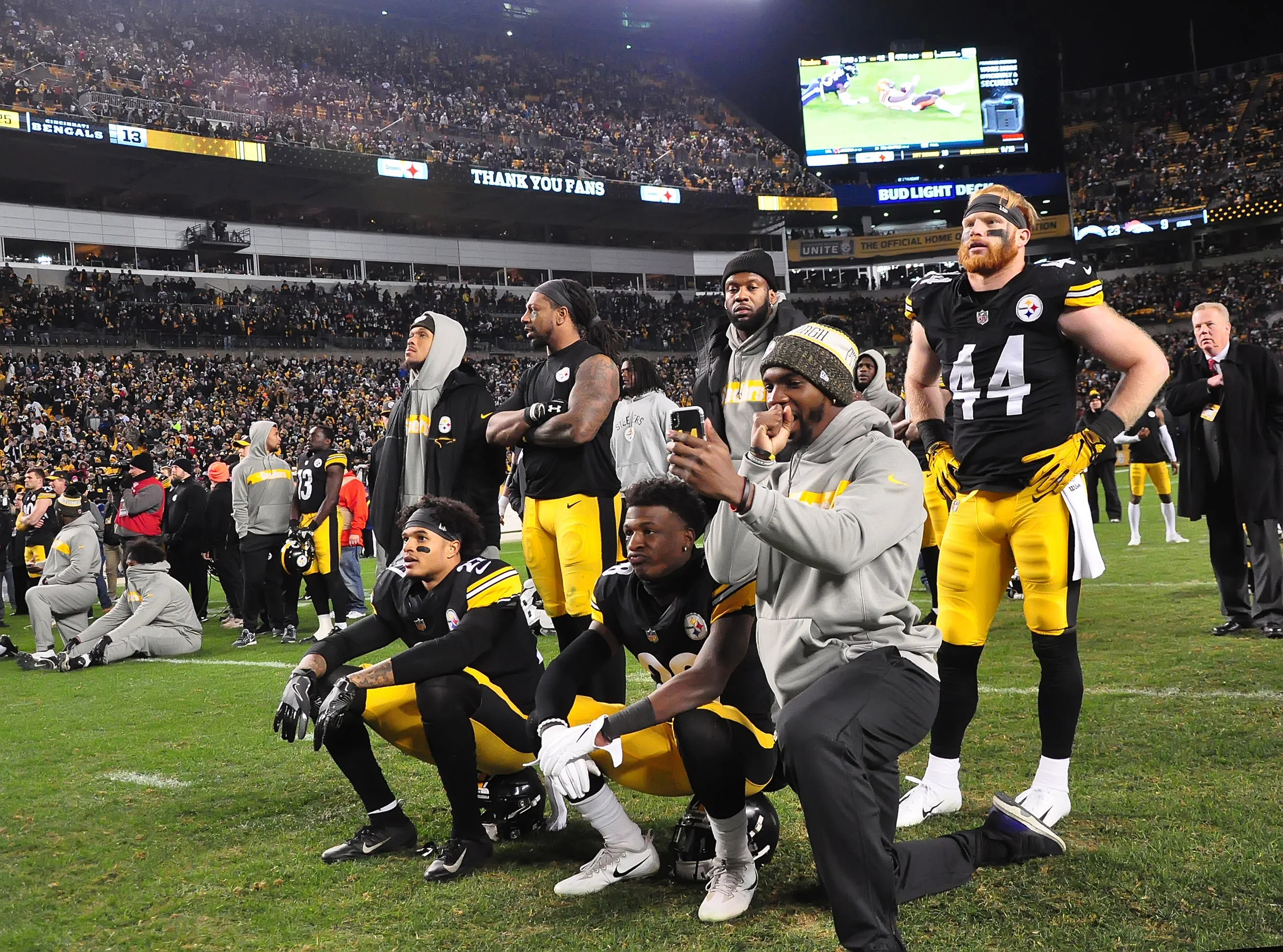 What an interesting situation yesterday after the Steelers defeated the Bengals. The Steelers needed to win their game and they needed the Browns to defeat the Ravens, in order to make the NFL Playoffs. As it turned out the Steelers game ended earlier then the Browns/Ravens game. Many of the Steelers’ players and coaches stayed on the field to watch the end of the other game on the stadium big screen. It seemed like every fan stayed in their seats to do the same thing. It was so weird hearing a stadium full of Steelers fans cheering for the Cleveland Browns. Unfortunately, it didn’t turn out well for the Browns or Steelers…. Below are some photos from that moment.