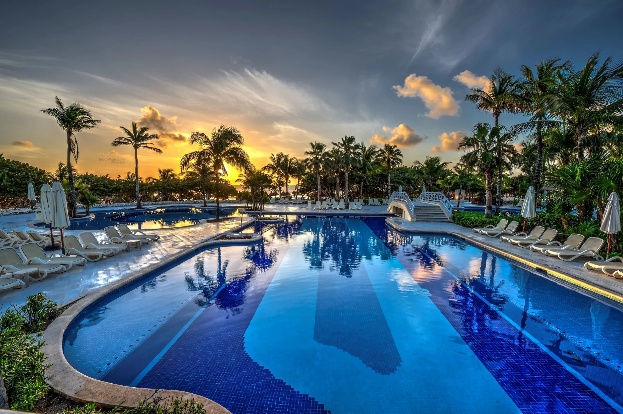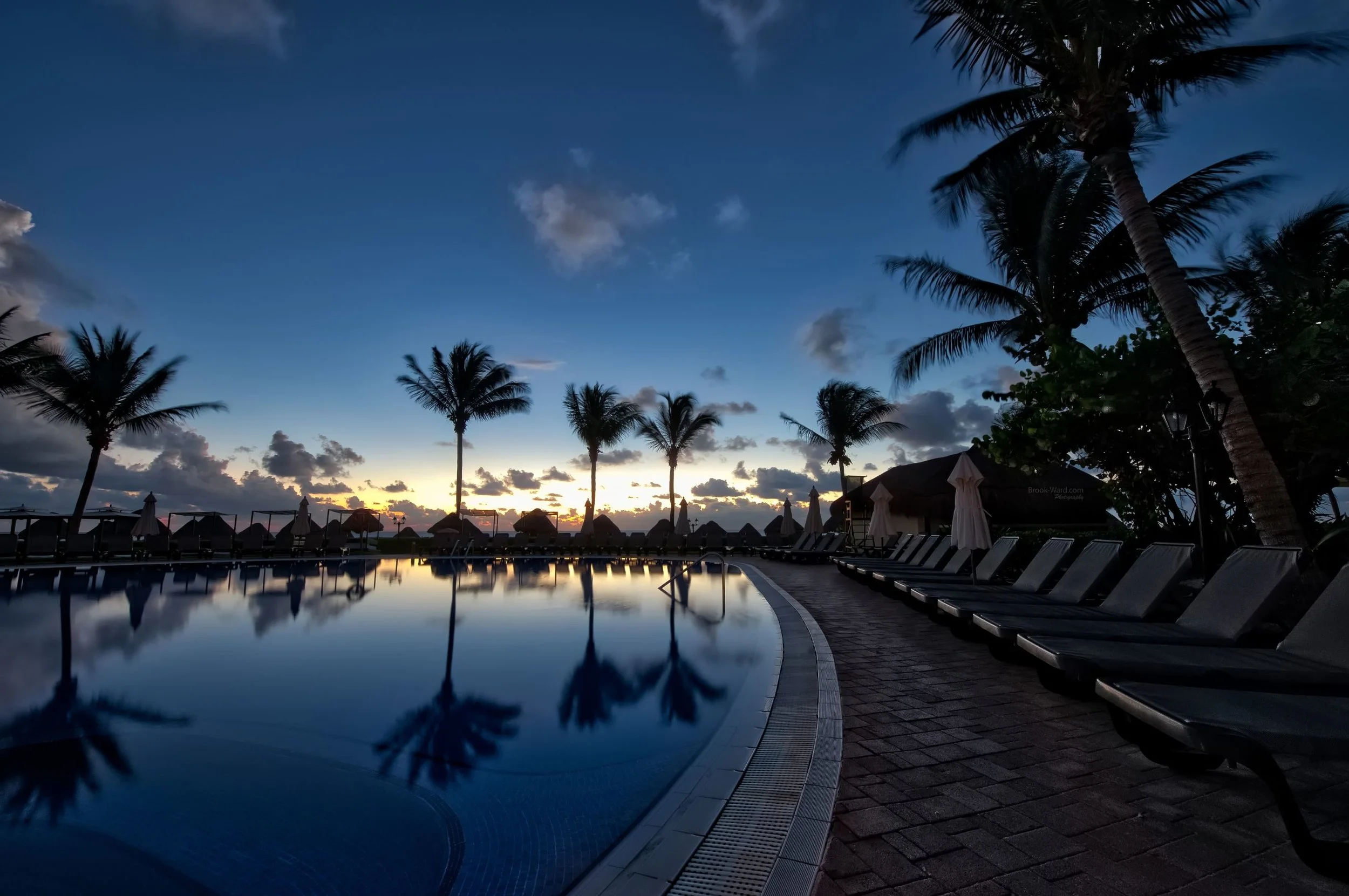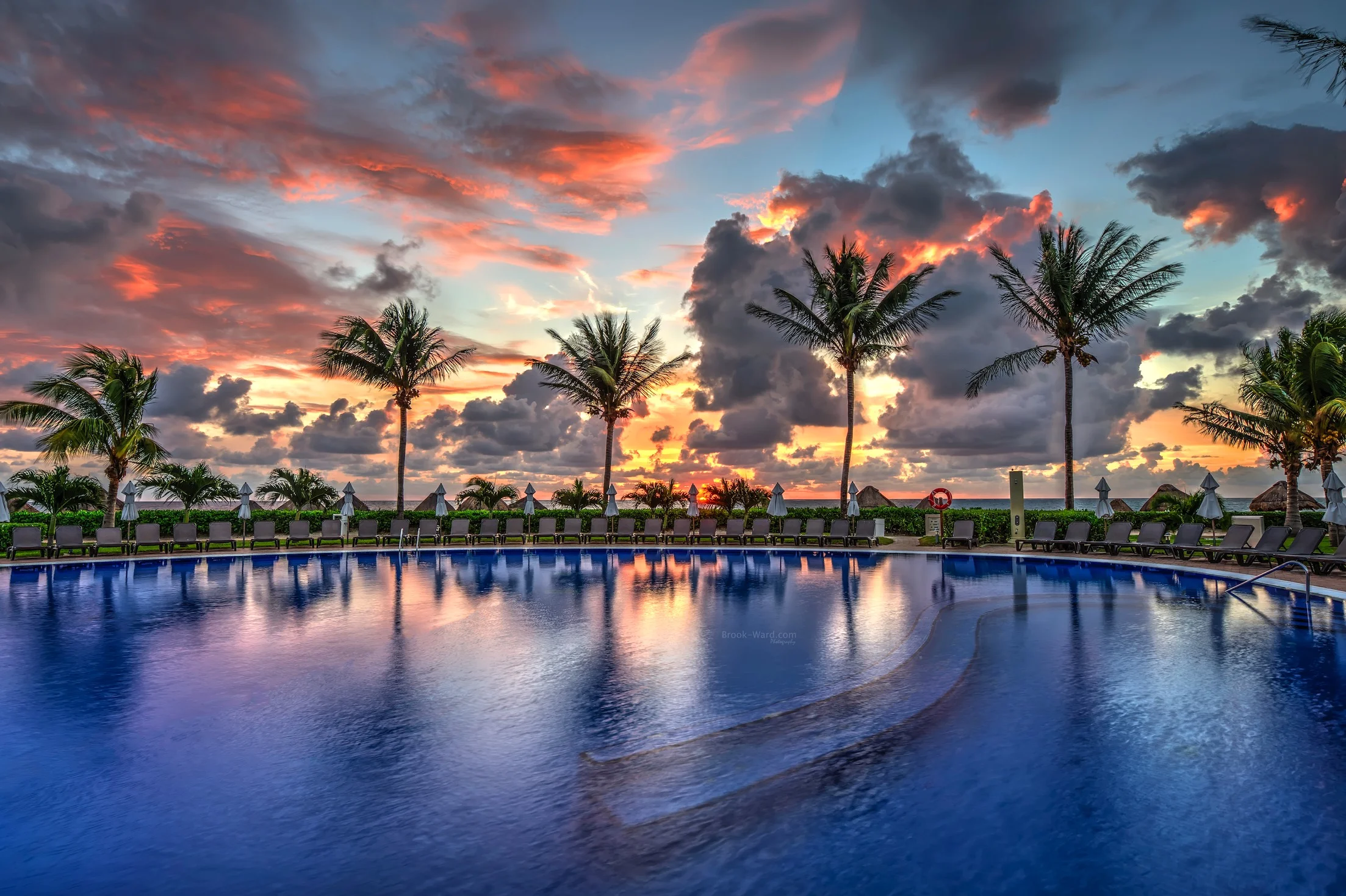 Note about the location: I took this photo in Puerto Morelos Mexico when we stayed at the Ocean Coral Resort. It is a pre-sunrise photo with the resort pool in the foreground.