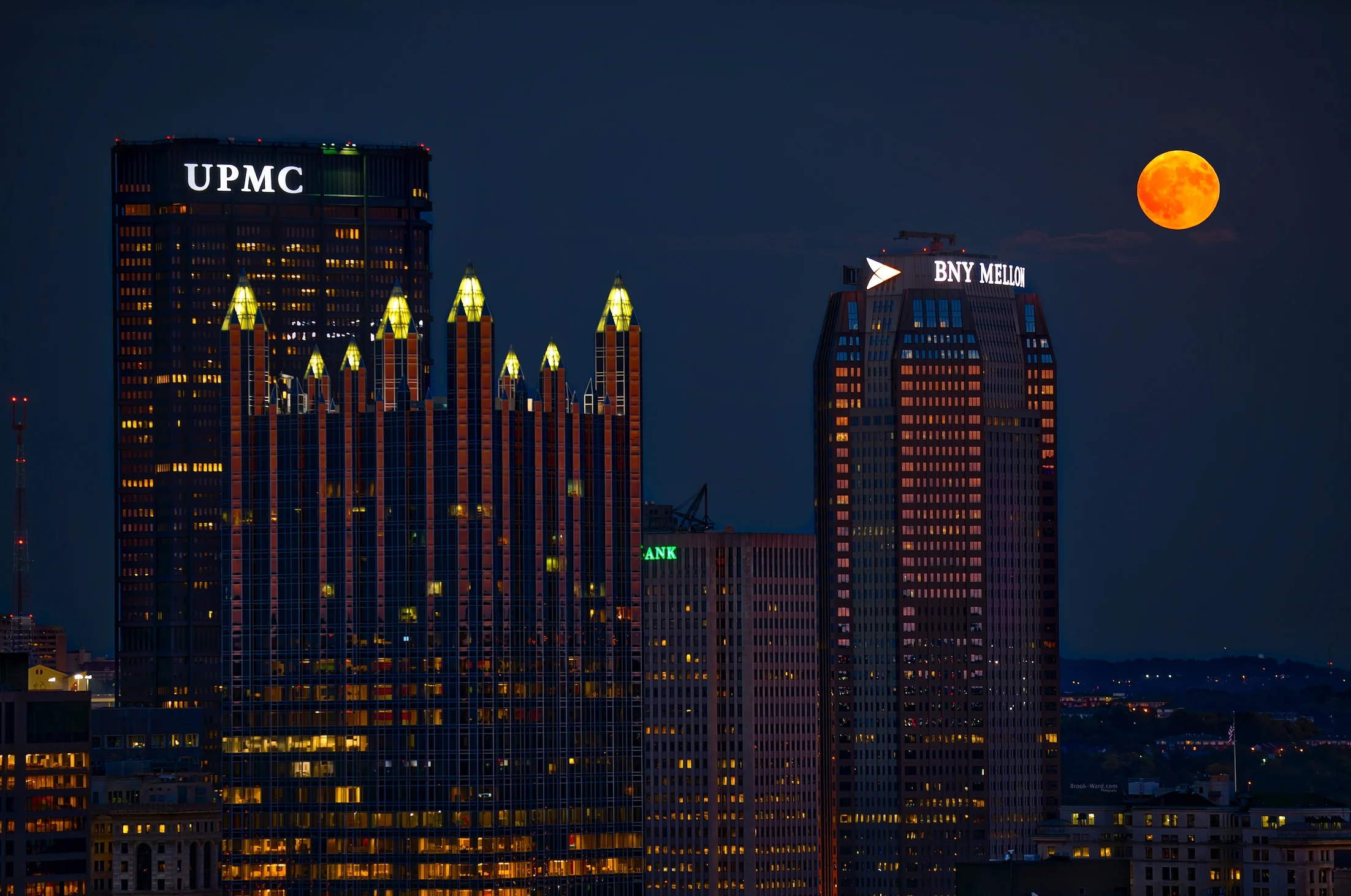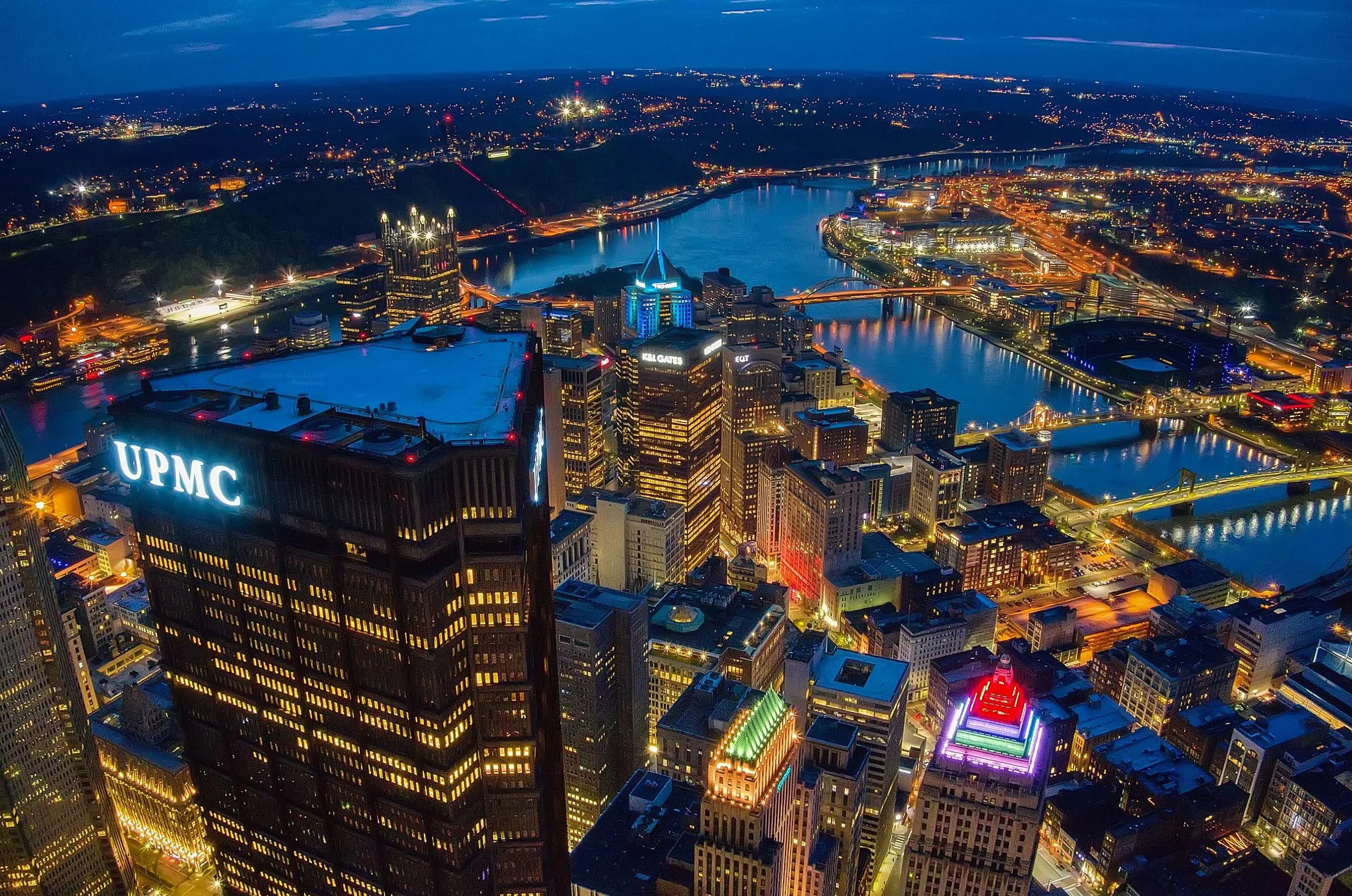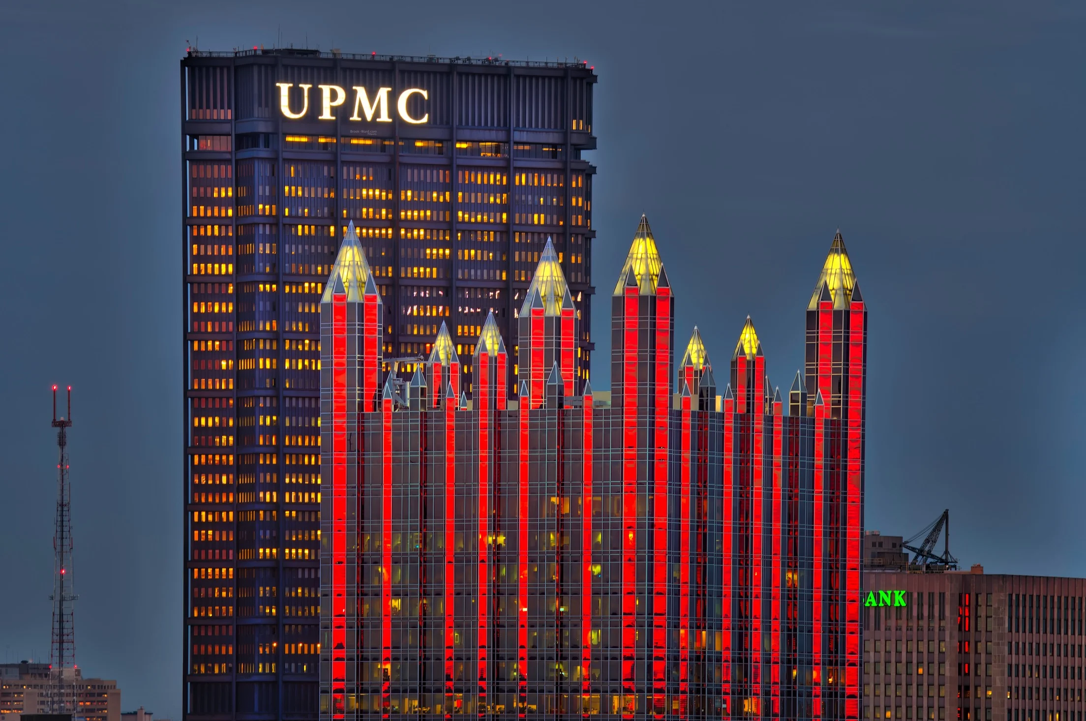 If you’re not familiar with Pittsburgh, this building is called the US Steel Building (even though it has UPMC on it) and is the tallest building in the city. There are great views from within and outside.